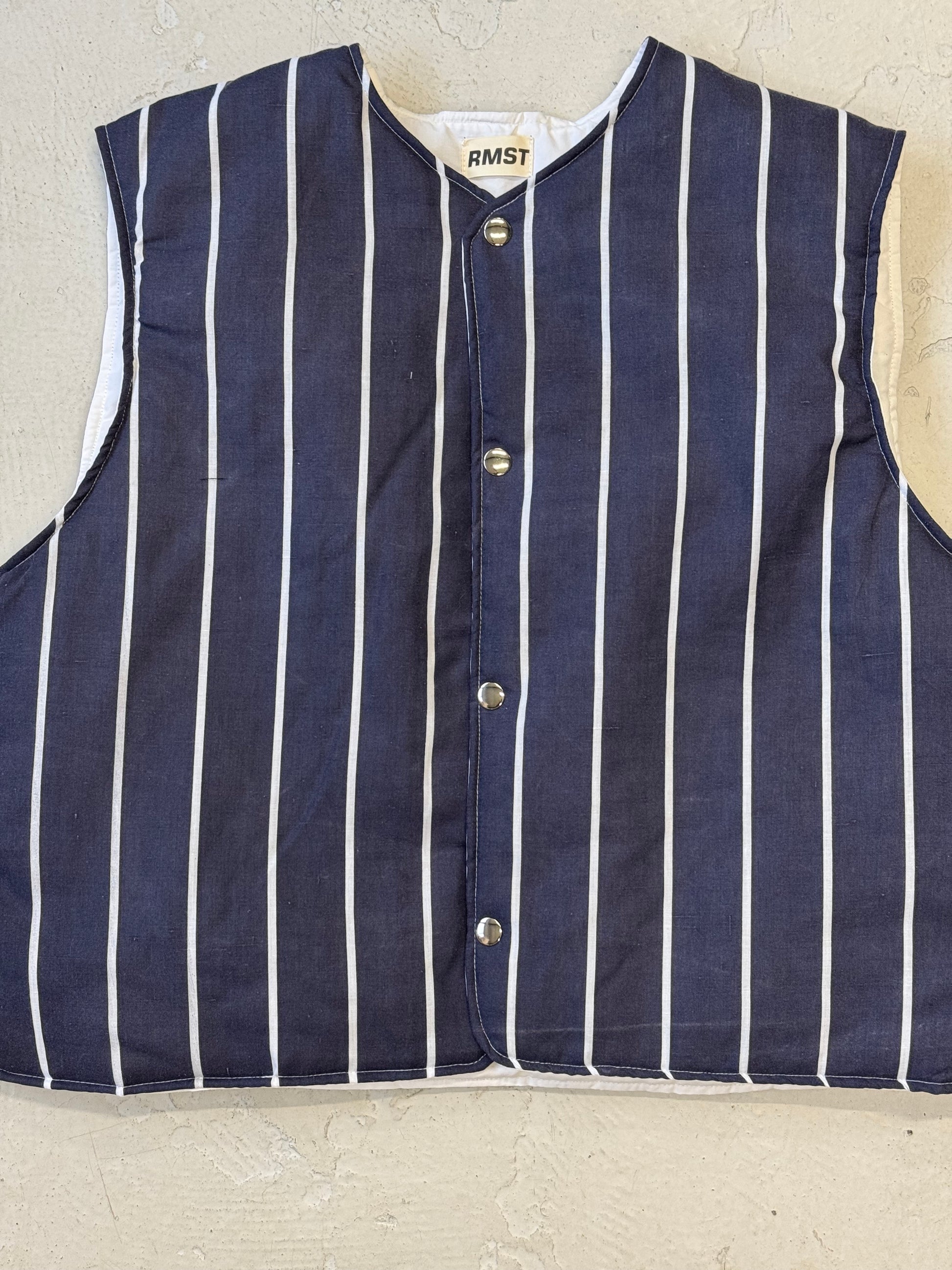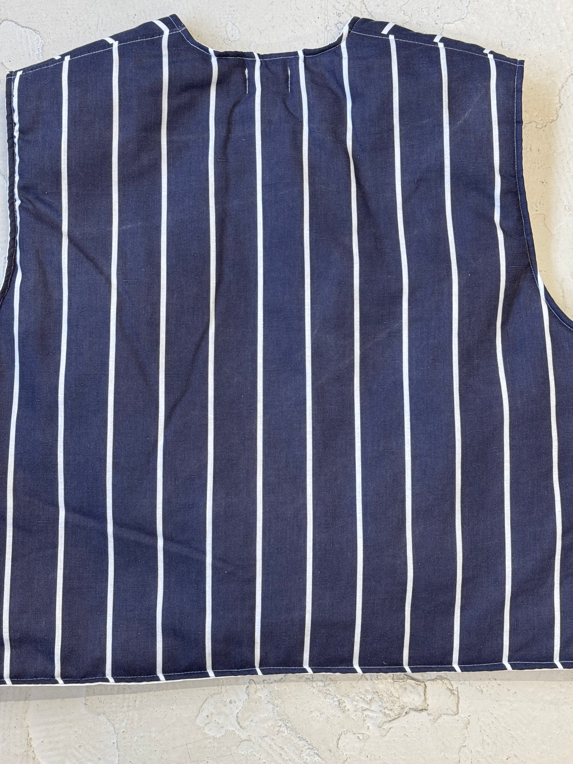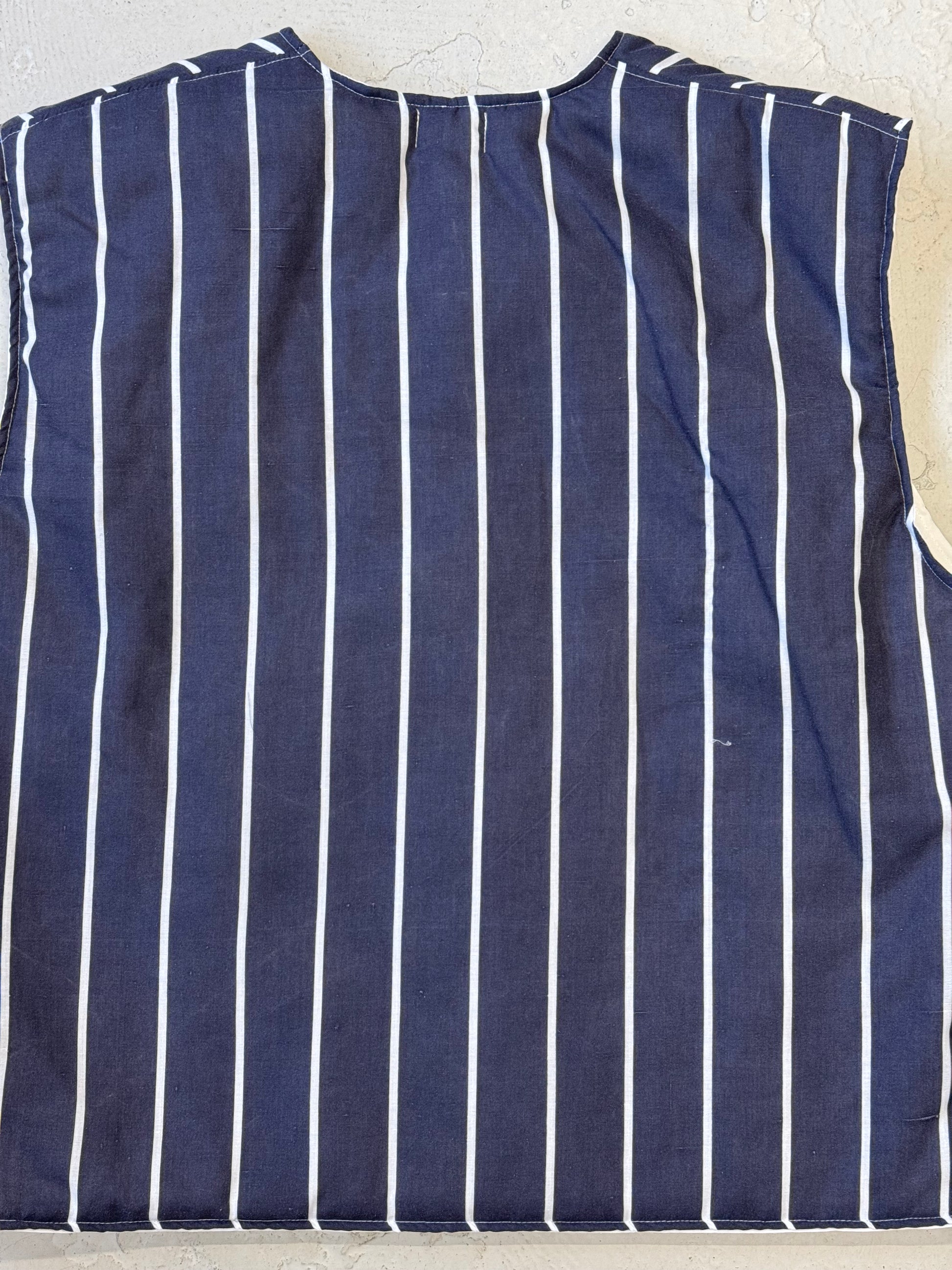 REWORKED FROM A NAVY + WHITE STRIPED DUVET SET, FULLY LINED, PADDED WITH A POPPER FASTENING.