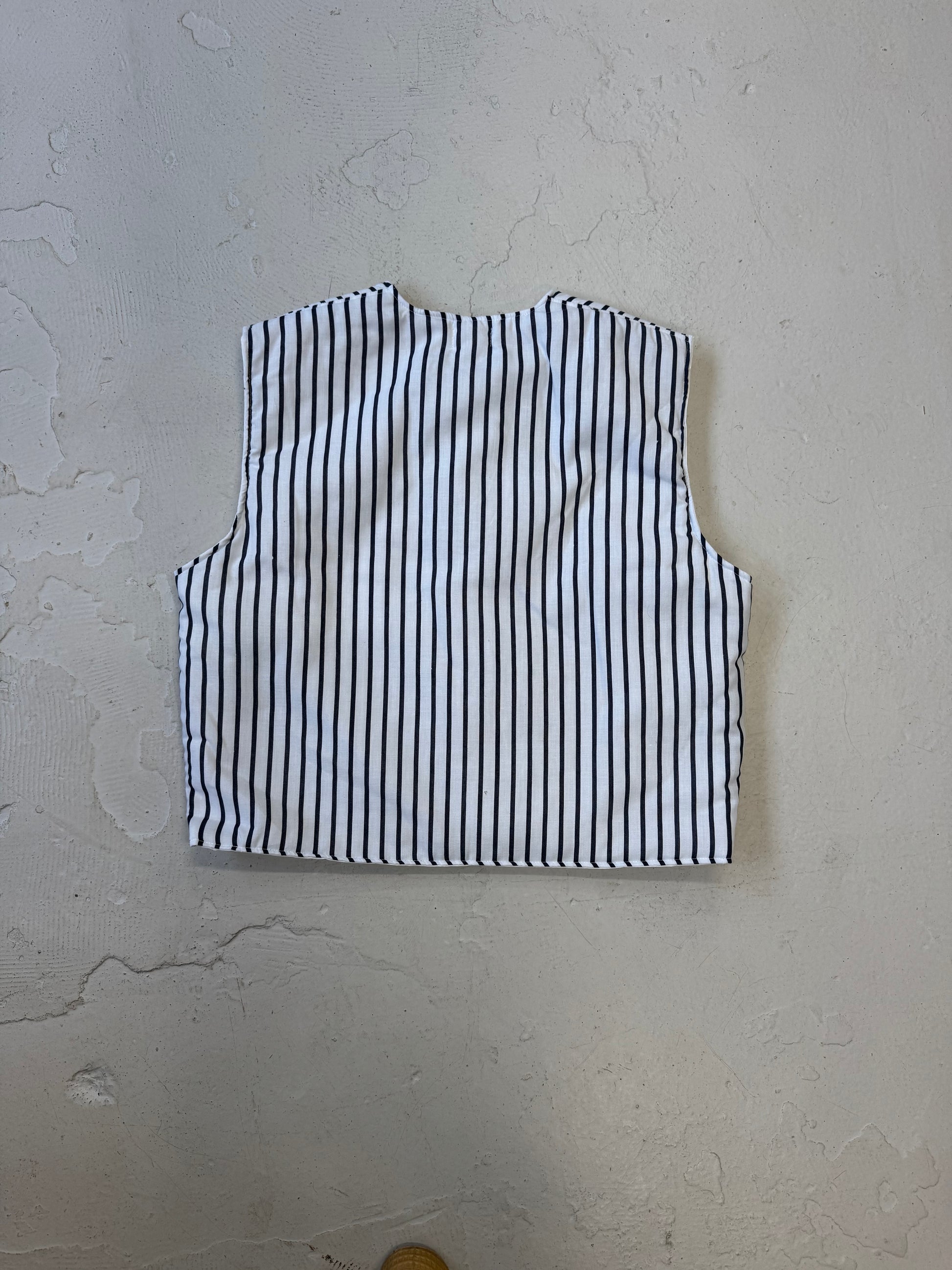 REWORKED FROM A WHITE + NAVY STRIPED DUVET SET, FULLY LINED, PADDED WITH A POPPER FASTENING.
